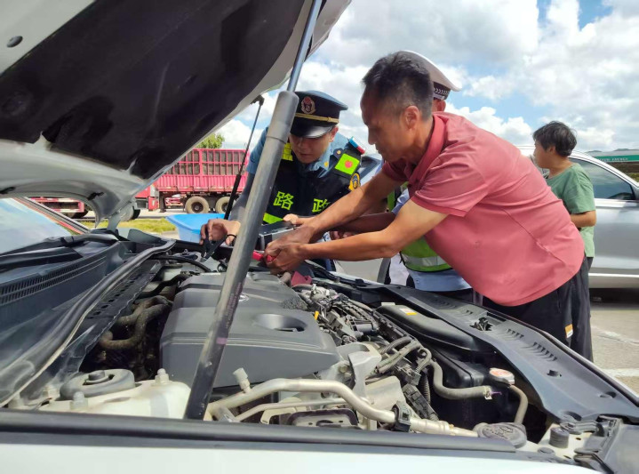 车辆电瓶亏电,路政“牵线搭电”助返程