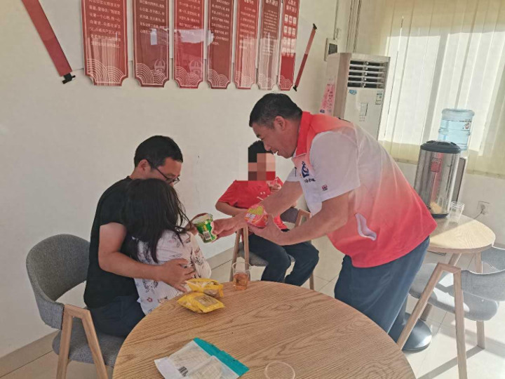 10月5日15时40分,韶关南学雷锋服务点前突然停下一辆粤A牌小轿车,一男子抱着哭闹不止的女孩匆匆下车,眼神里满是焦急。收费站志愿者刘大超和邓海苹发现后,立即上前询问,得知司机王先生独自带着一双儿女从广州赶回湖南老家过中秋,行驶途中因后排熟睡的6岁是女儿突然醒来并大声啼哭,自己不能既开车又照顾小孩,无奈之下只能临时下高速安抚女儿。了解情况后,志愿者刘大超为他们递上了解暑凉茶,并取来方便面和面包,与孩子亲切交谈,不一会儿,孩子就露出了天真的笑容。
