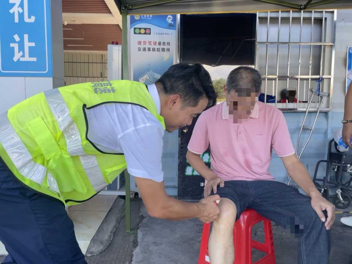 10月6日15时30分,一位紧锁的眉头的司机师傅引起了志愿者朱上岳的注意,上前询问得知,司机廖师傅从江西南昌驱车前往广州,因长途驾驶导致膝盖受损,疼痛难忍。了解情况后,朱上岳迅速引导廖师傅至便民服务点坐下,从便民药箱取出云南白药气雾剂,细心为廖师傅膝盖处均匀喷洒镇痛并贴心递上凉茶,其贴心服务获得廖师傅连连称赞。